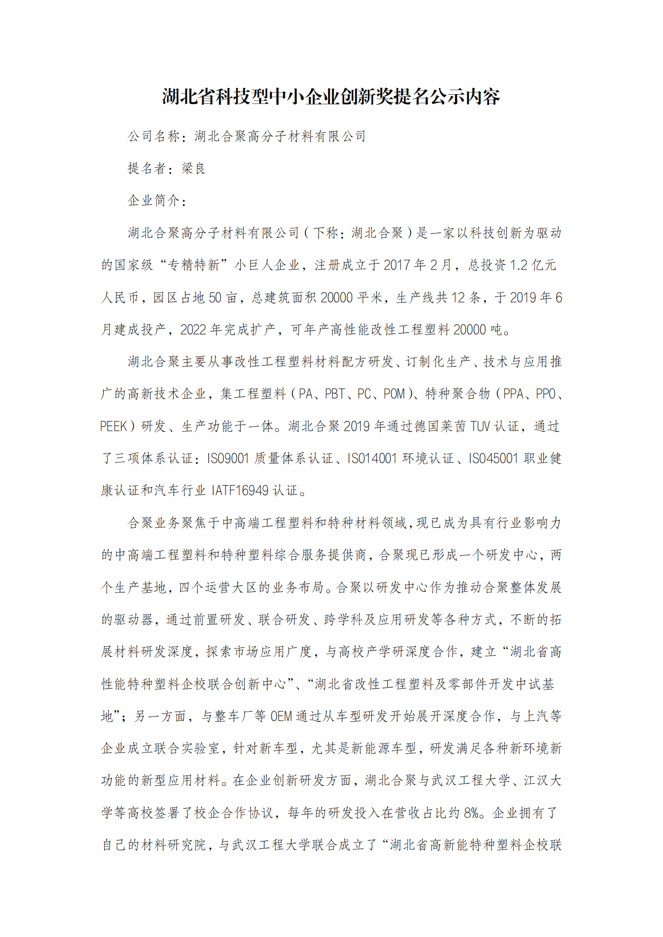 湖北省科技型中小企業(yè)創(chuàng)新獎提名公示內(nèi)容